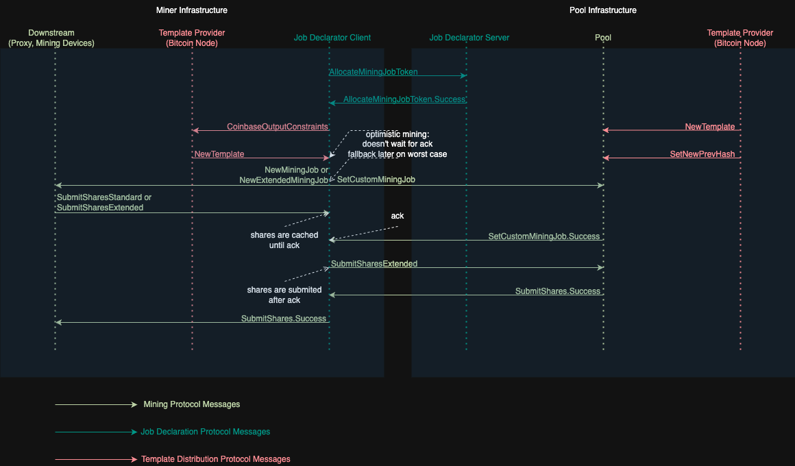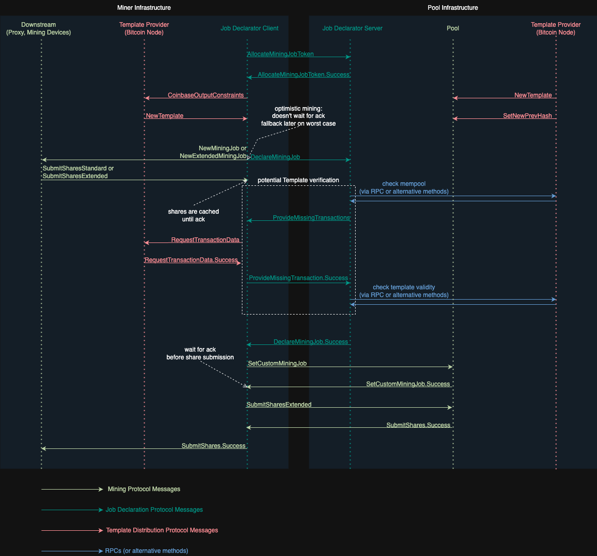 SetCustomMiningJob, acknowledged viaSetCustomMiningJob.Success. - if a valid block is found, both JDC and JDS propagate it.